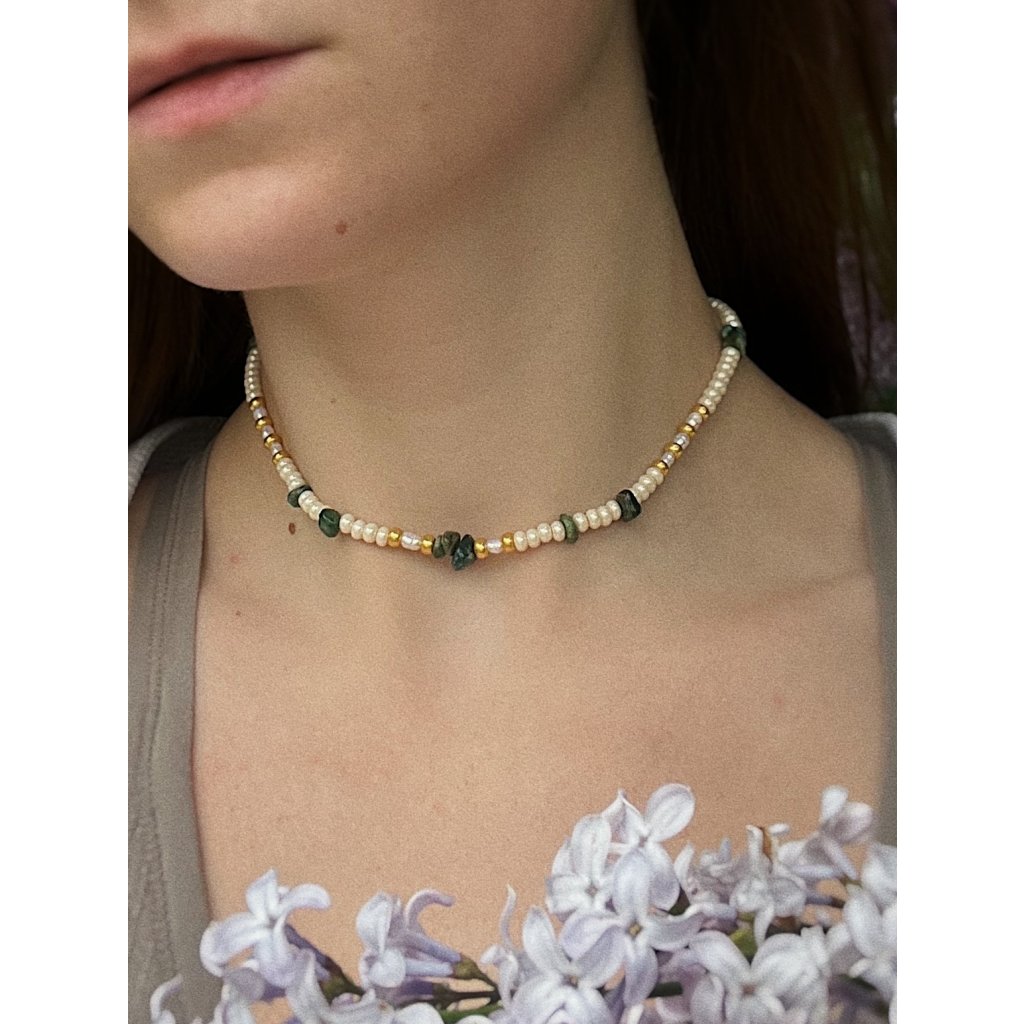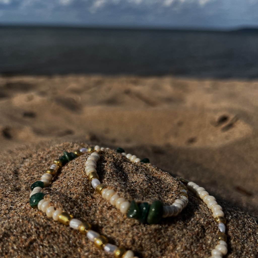 Náhrdelník, ve kterém se setkává svěží zeleň minerálních korálků se sametovou hloubkou říčních perel, jemností mléčných tónů a decentním zlatavým odleskem. Připomíná klidný pobřežní podvečer – chvíli, kdy se chlad kamene mísí s teplým větrem od moře a voda tiše hladí pobřeží.