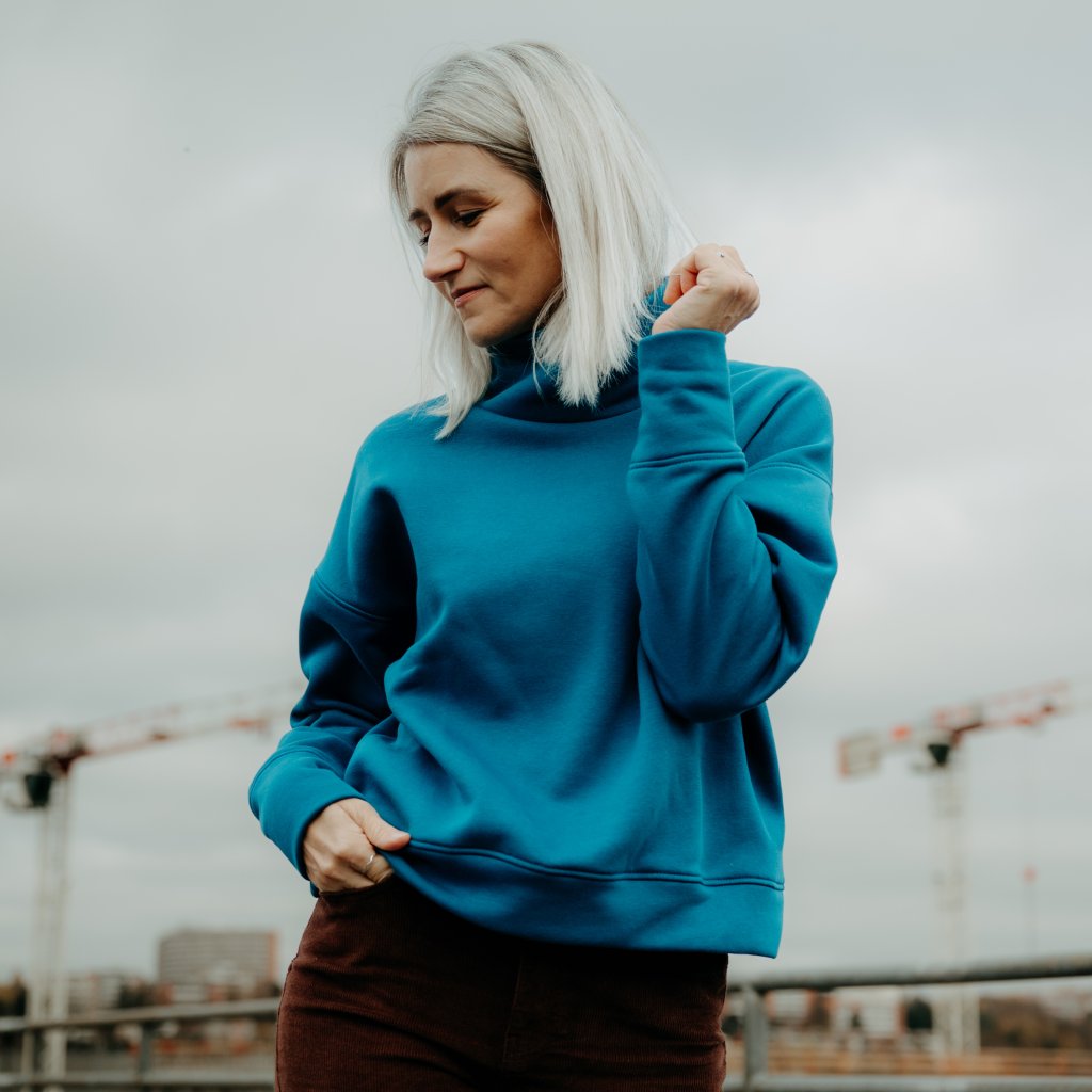 Úplet je pružný, z rubu chloupek, ve složení 70% bavlna, 30% PES.