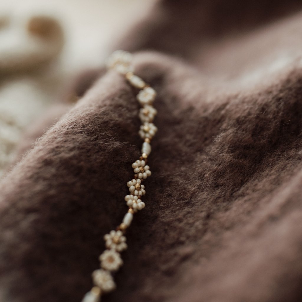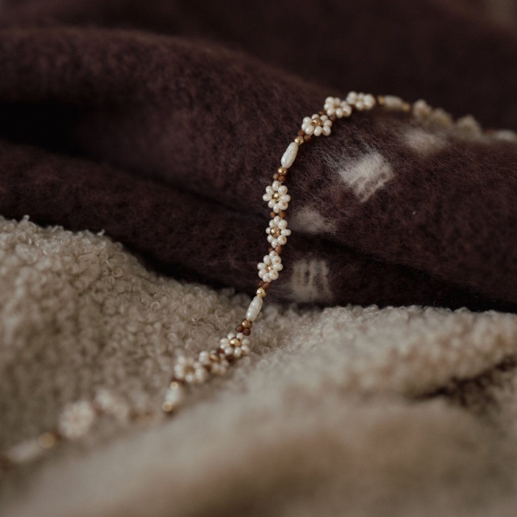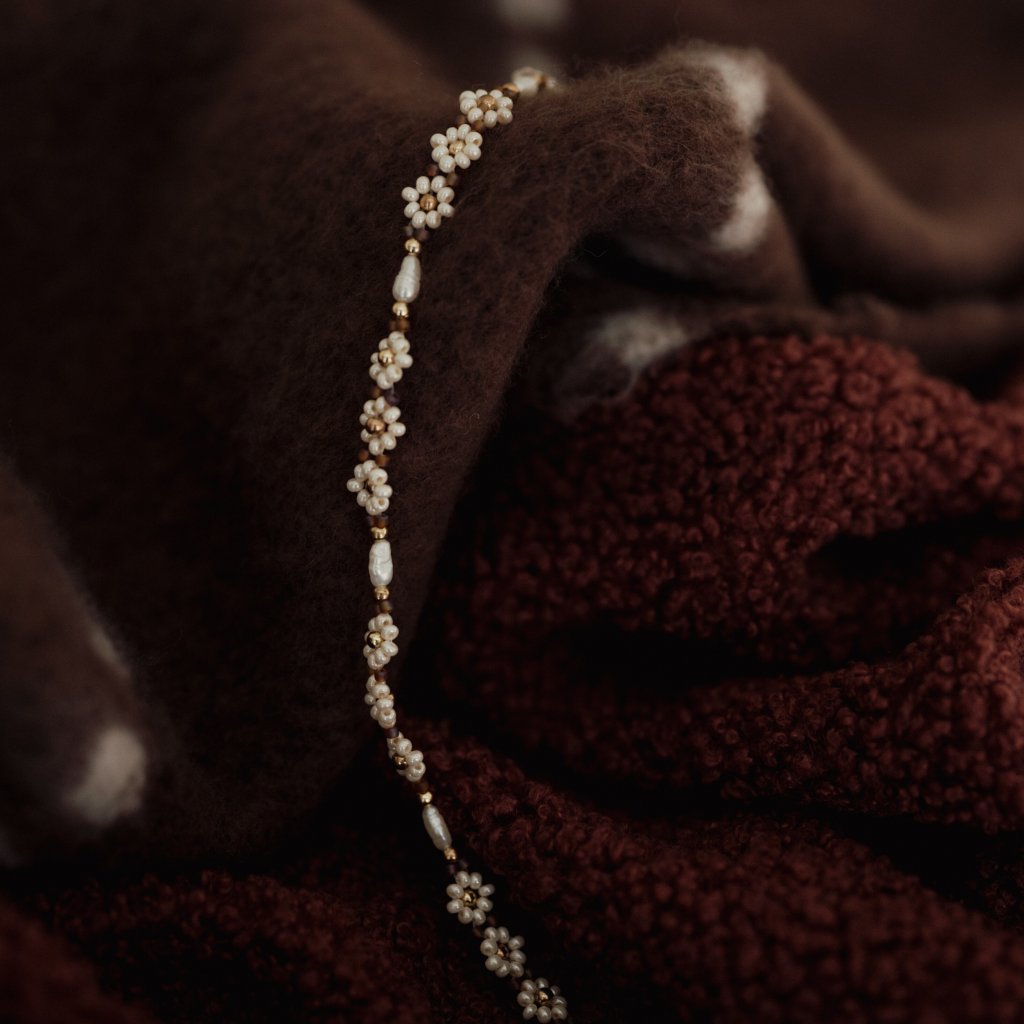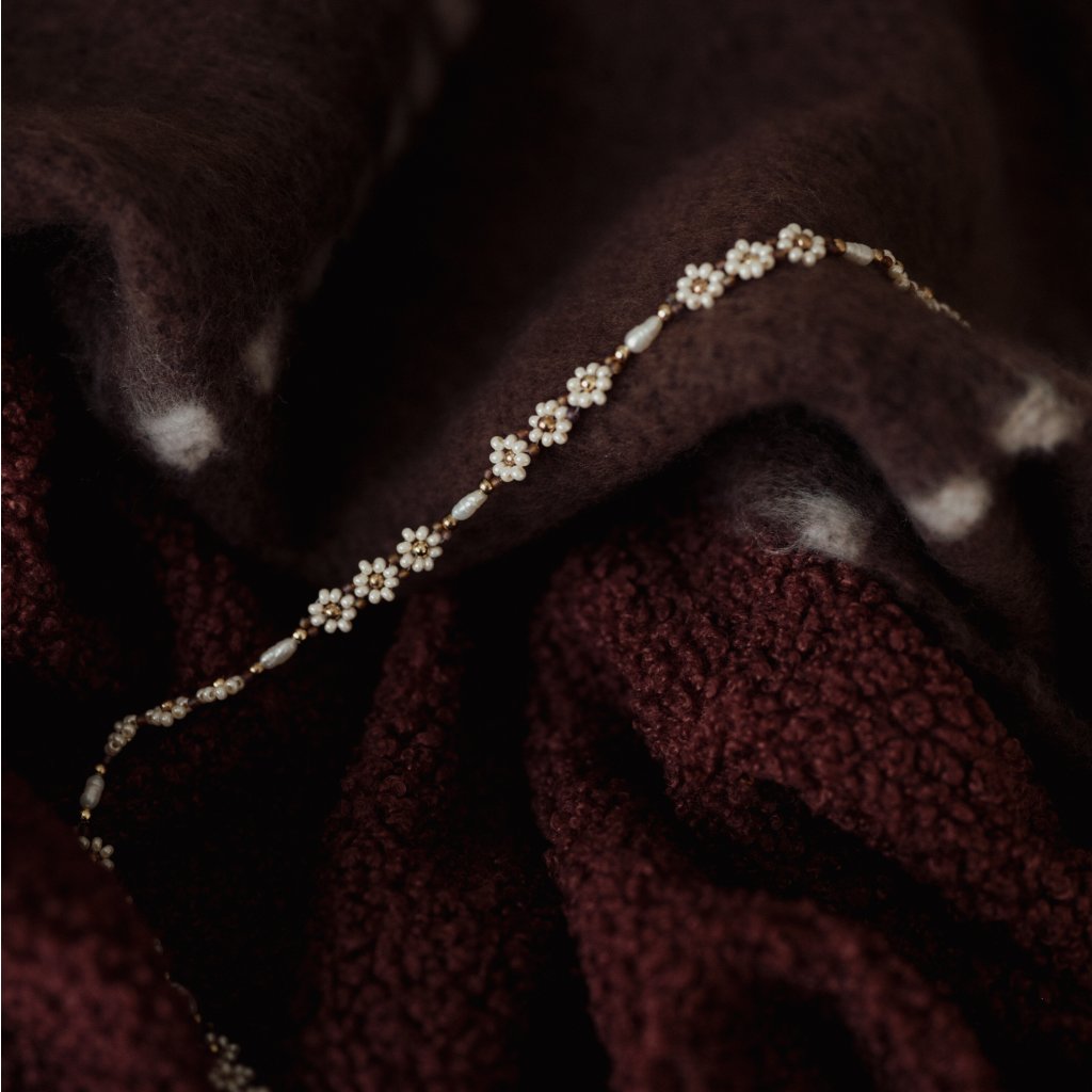 Krémové kvítky připomínají ozdoby dávných věnců, teplé korálově-fialové tóny nesou měkkost historických látek a říční perly září jako fragmenty příběhů, které přežívají čas. Každý kvítek je navlečen ručně, pomalu, jako by v sobě nesl malou vzpomínku.