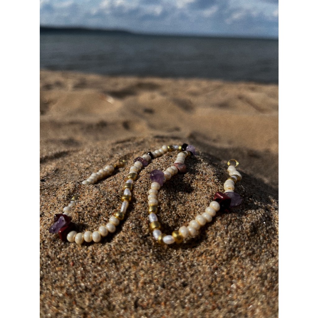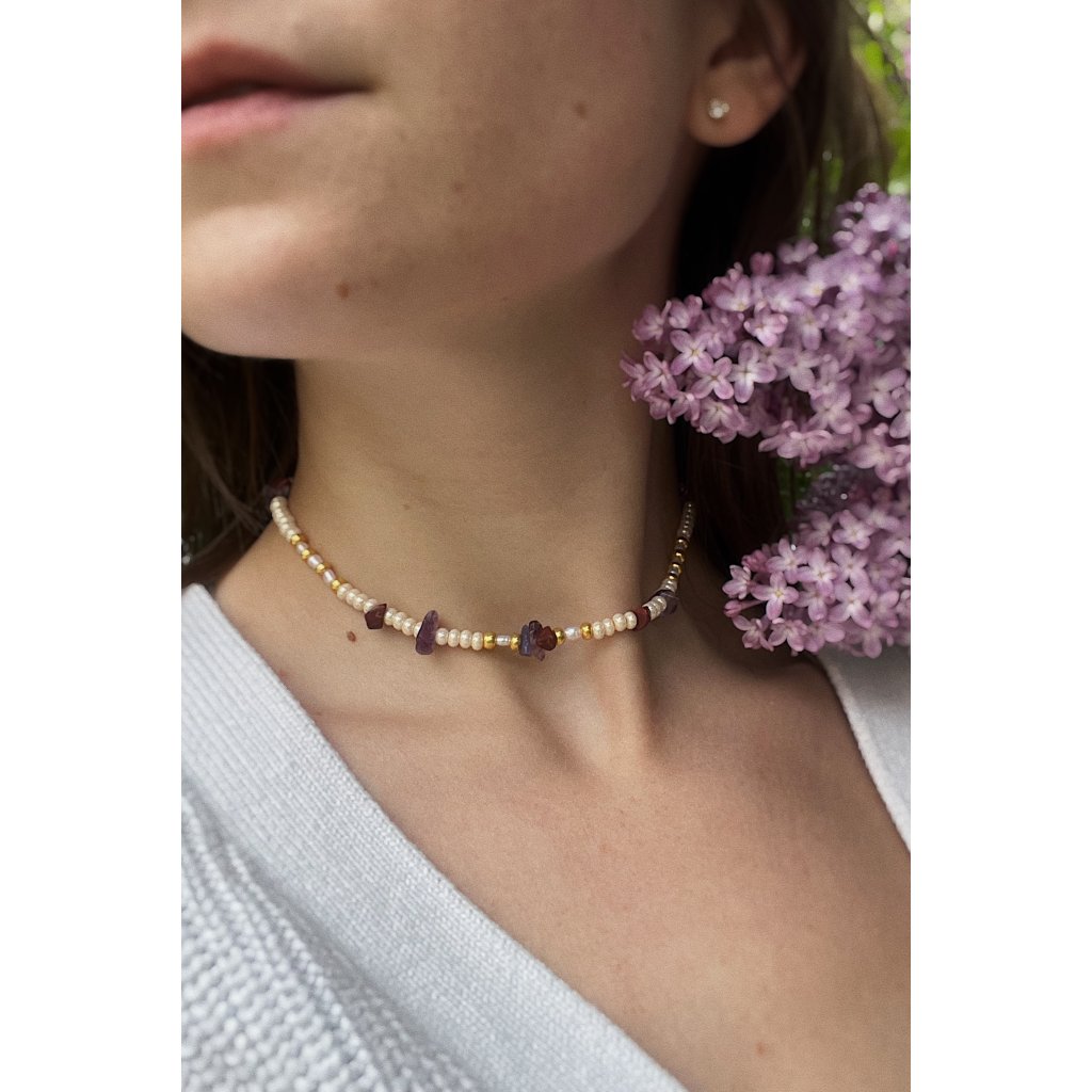 Náhrdelník, ve kterém se setkávají něžné růžové a fialové tóny minerálů s jemným, přirozeným leskem pravých říčních perel. Připomíná první ranní světlo, které se tiše rozprostírá po květech šeříku — křehké, tiché a nenápadně kouzelné.