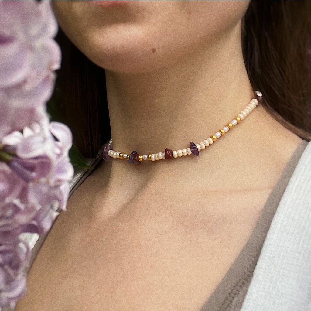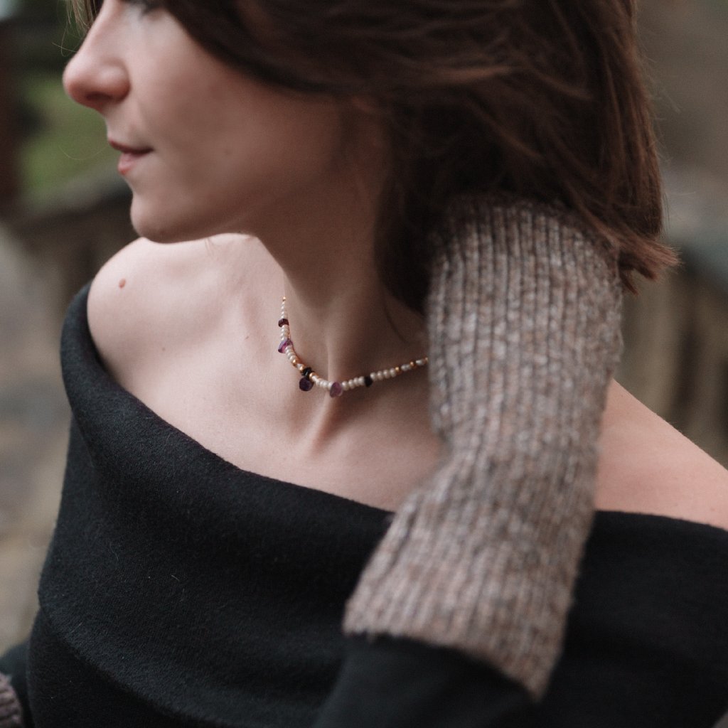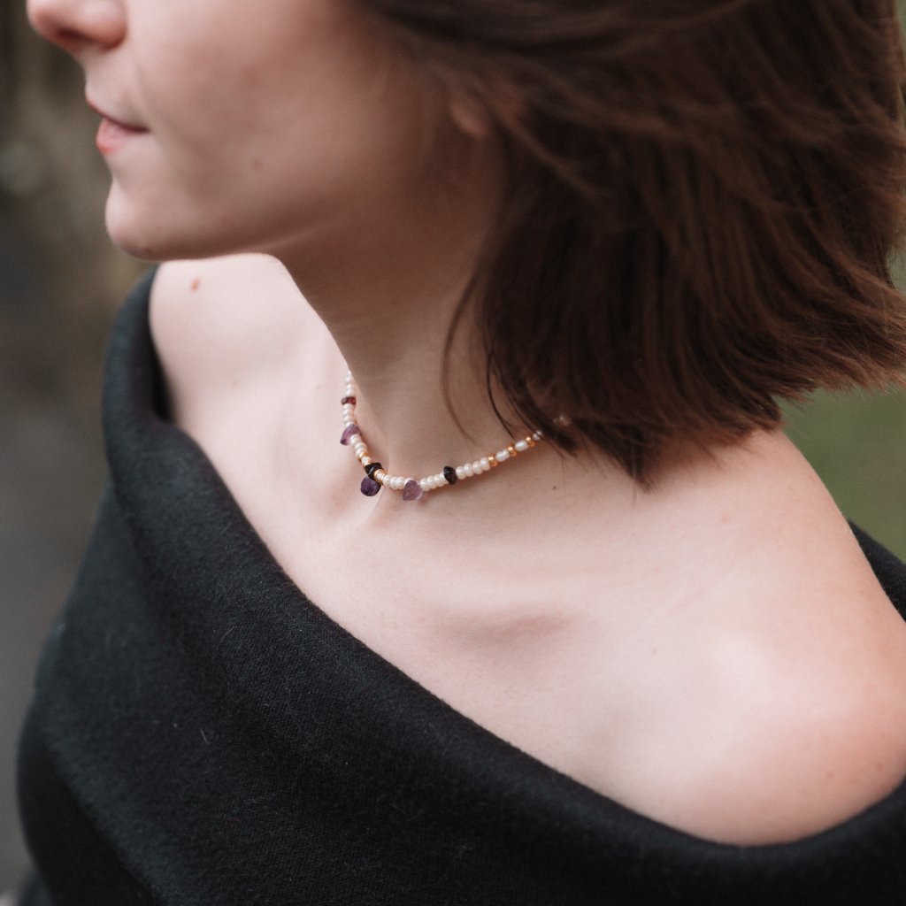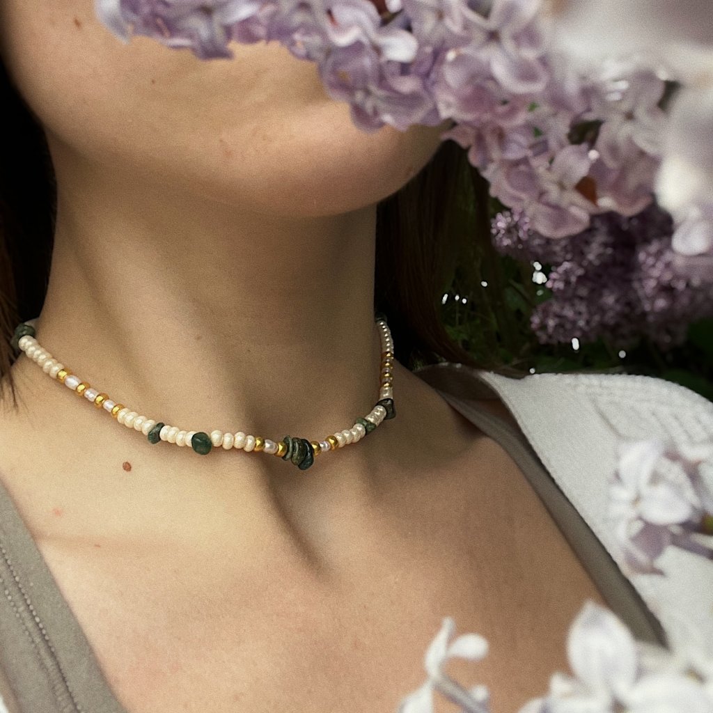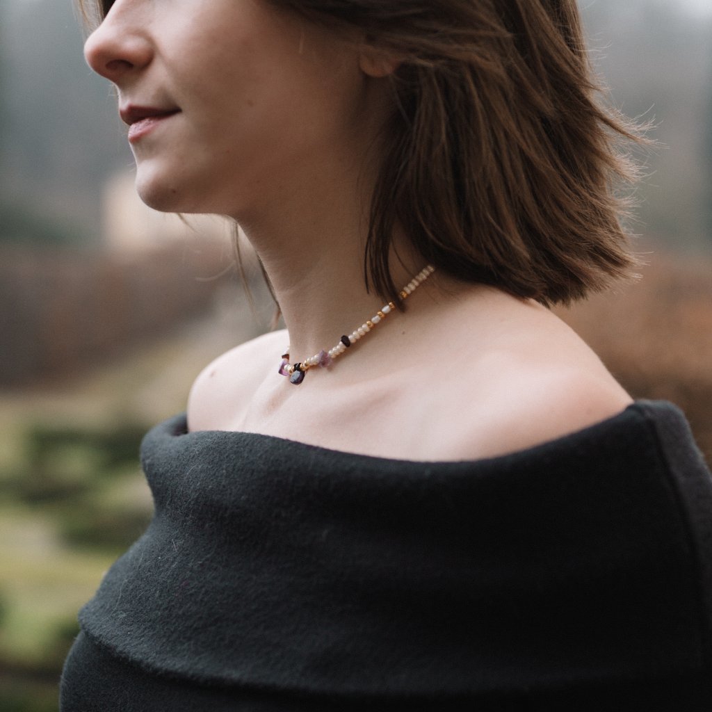 Minerální korálky v zelené nebo fialové variantě vytvářejí odlišné atmosféry: svěží, zemitý tón připomínající mech po dešti a tichý lesní vzduch, nebo něžné fialové a růžové odstíny evokující květy šeříku zahalené ranní mlhou. V obou verzích se přirozeně prolínají s jemným leskem pravých říčních perel a decentním zlatavým akcentem.