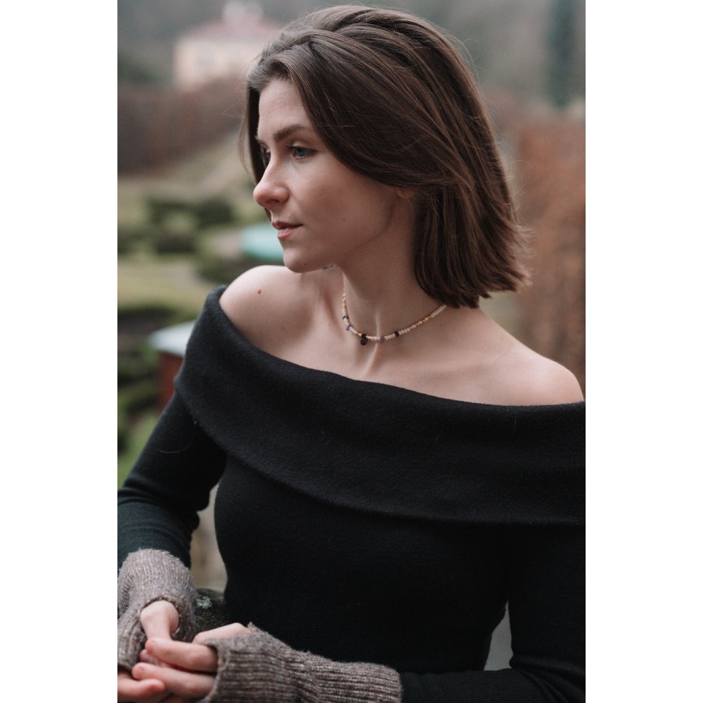 Kompozice je záměrně lehce nepravidelná, plynoucí a živá — navržená tak, aby se náhrdelník přizpůsobil pohybu, náladě i osobnímu rytmu nositelky. Každý kus je ručně sestavený s důrazem na rozestupy, ticho mezi prvky a přirozenou krásu materiálů.